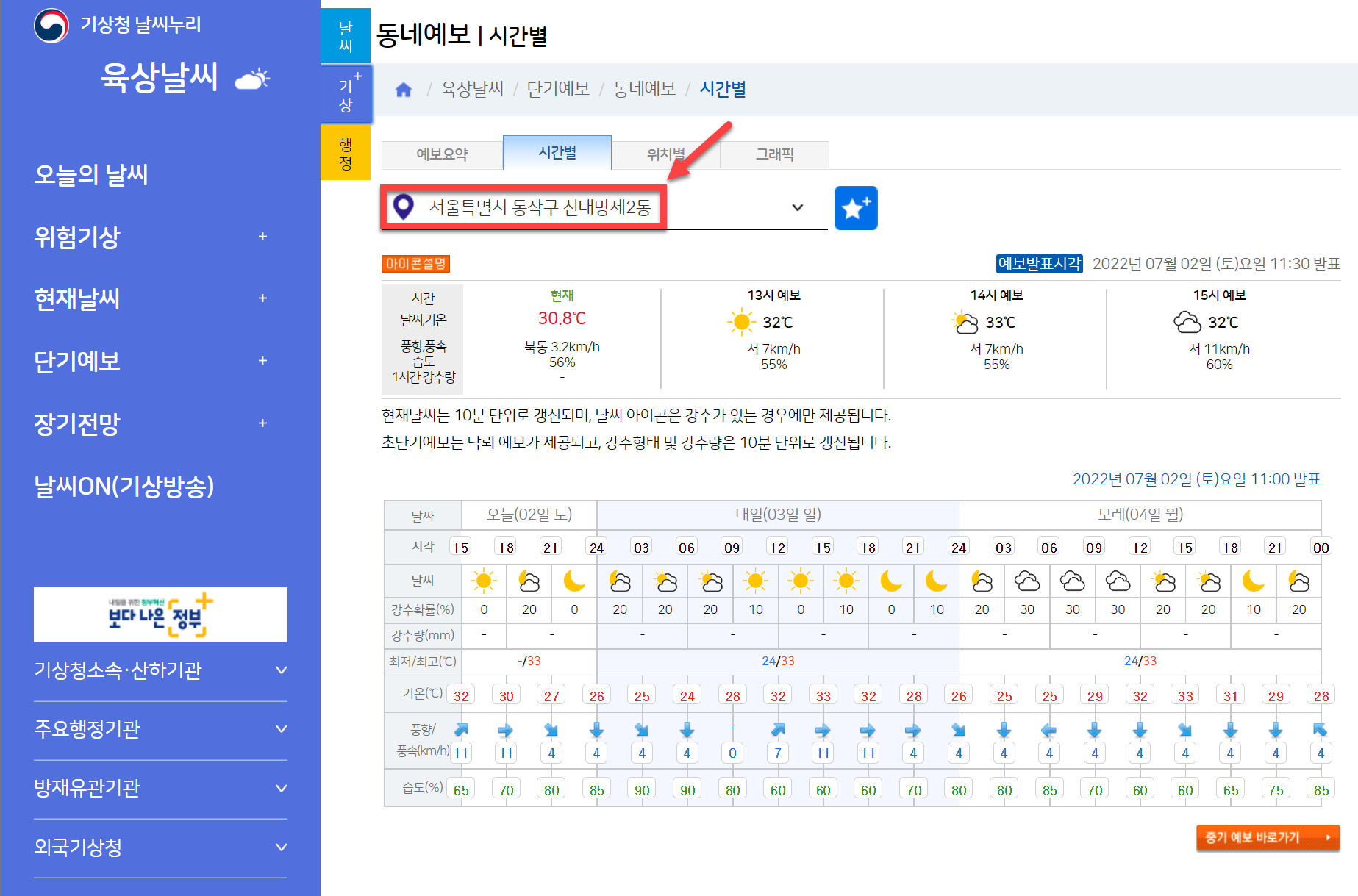 기상청 사이트에 들어가는 것은 쉬우나 그곳에서 동네예보를 확인하는 것은 굉장히 복잡하지요. 조금이라도 쉽게 들어가기 위하여 제가 위에 링크를 가져 왔습니다. 이것만 클릭을 하시면 본인이 있는 위치의 2일 안의 날씨를 보여줍니다. 저도 자주 이용합니다. 즐겨찾기를 해놓을만 하지요.